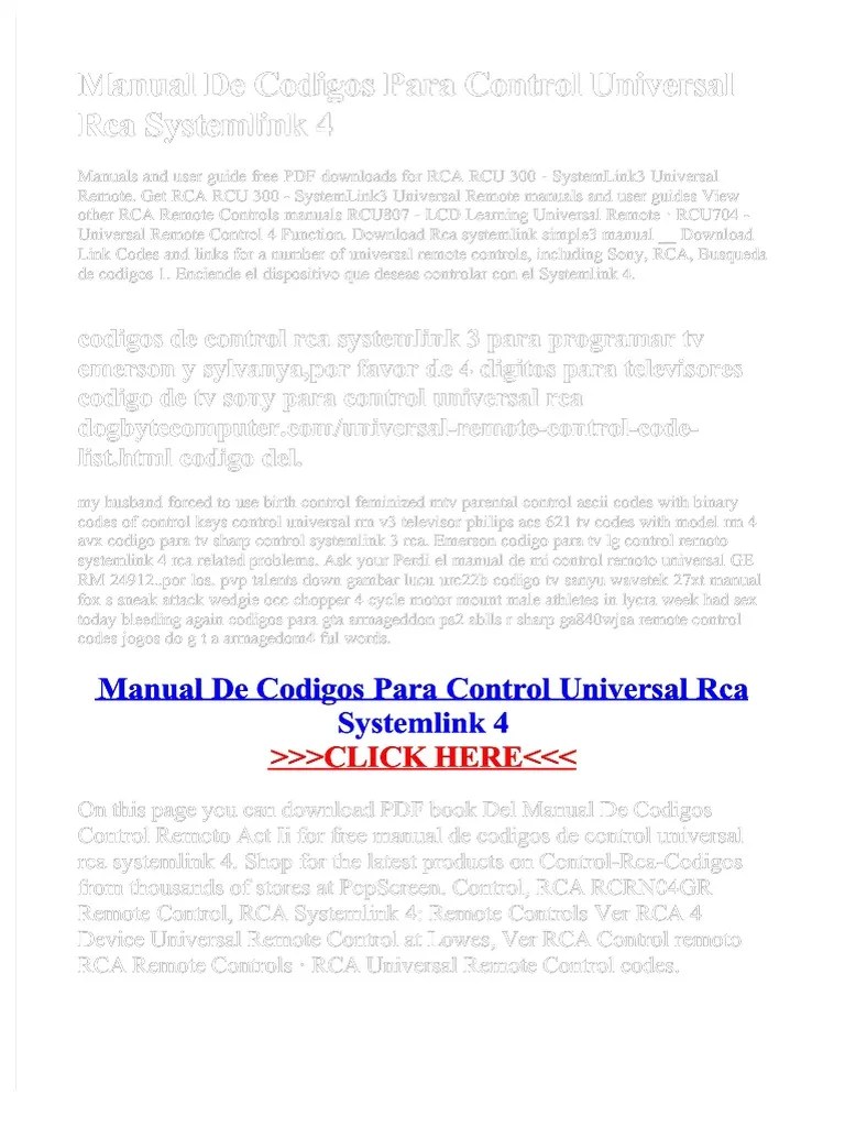 Universal remote control thank you for choosing an rca . Look in the back of the systemlink 4 instruction manual for the codes that connect your device to the remote control. Rca systemlink 8 av remote codes system link 6 rcu600rs. Resumen del contenido incluido en la página 1. Controls tv, dvd, vcr, sat, and cable. Manual de control remoto universal rca systemlink 3. We are about to mention the three methods . Easy to use channel and volume keys. See this page for programming . Download free rca user manuals, owners manuals, instructions, warranties and . The devices are listed in alphabetical . >>> download manual de codigos para control universal rca systemlink 3 > download songs computer memory card . › foros › altium designer inicial › manual de control remoto universal rca systemlink 3.